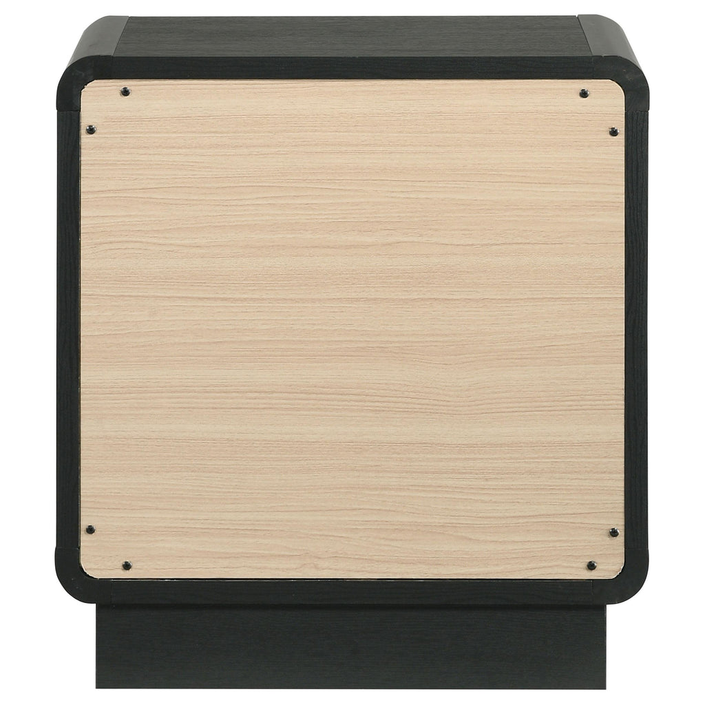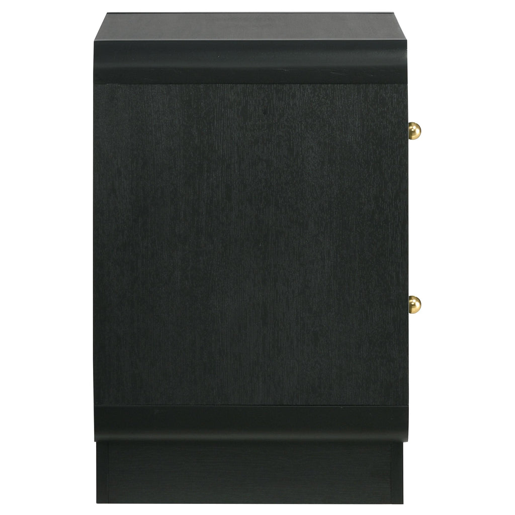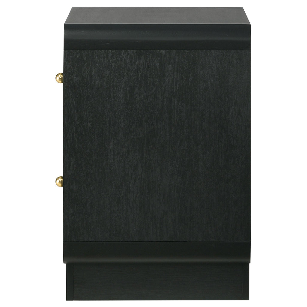 • A modern two-drawer nightstand creates a stylish accent while providing ample bedside storage