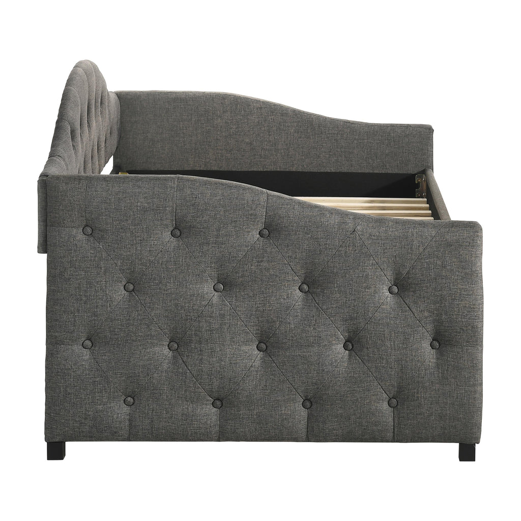 • A transitional camel back with button tufted detailing, creates a cozy focal point for any guest room or smaller sized area