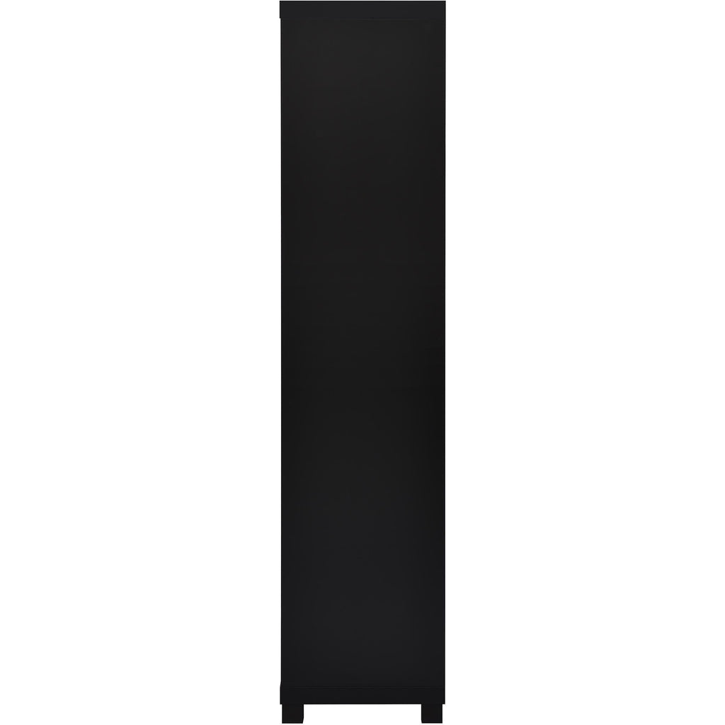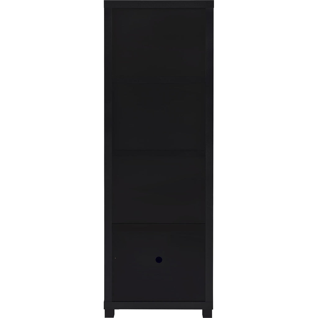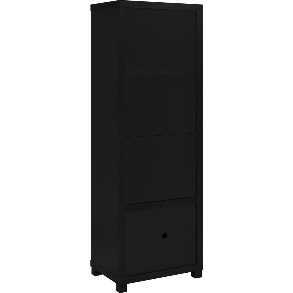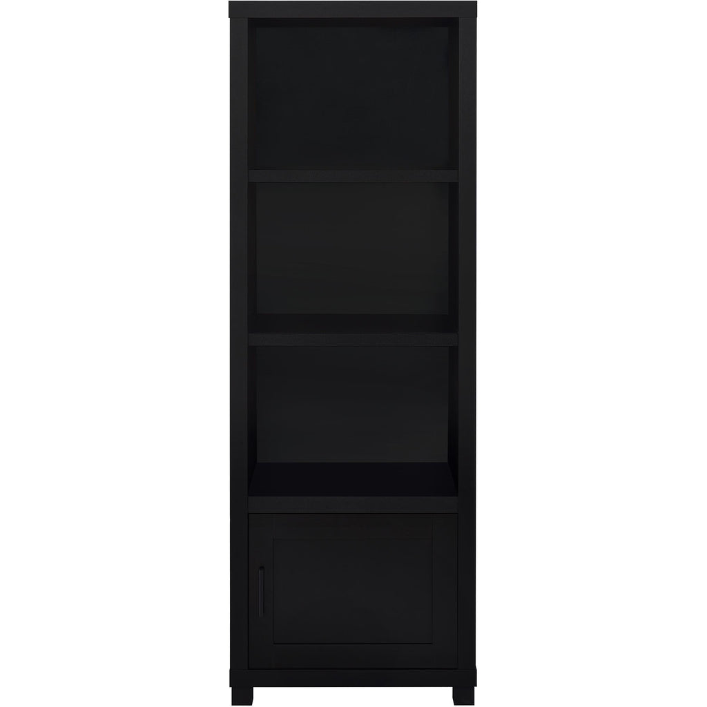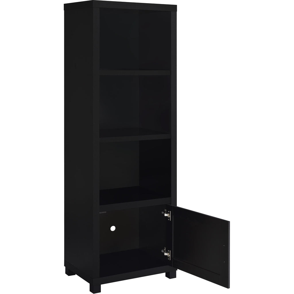 • Media towers feature three open shelves and a single-door cabinet for versatile storage
