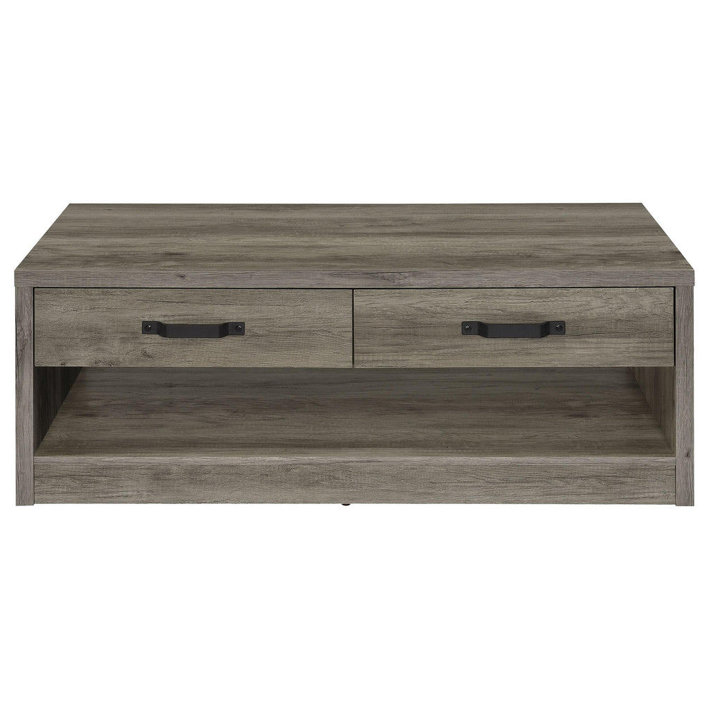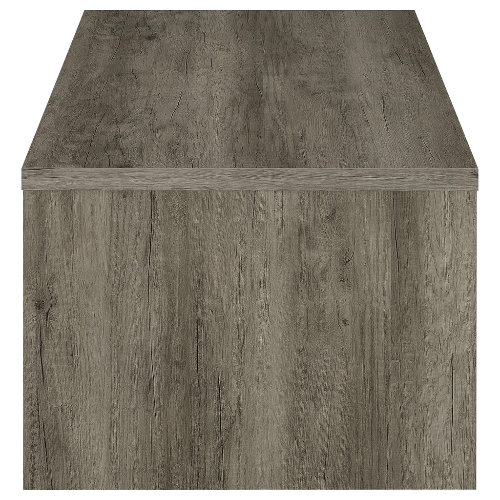 • Rectangular coffee table featuring a rustic gray driftwood finish for a natural wood look