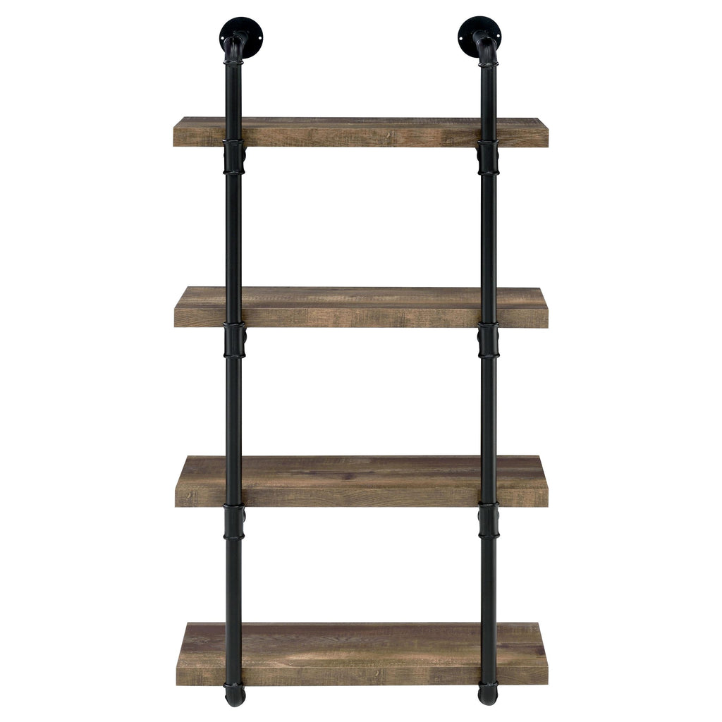 • Industrial style wall-mounted shelf in rustic oak finish with black plumbing pipe metal frame