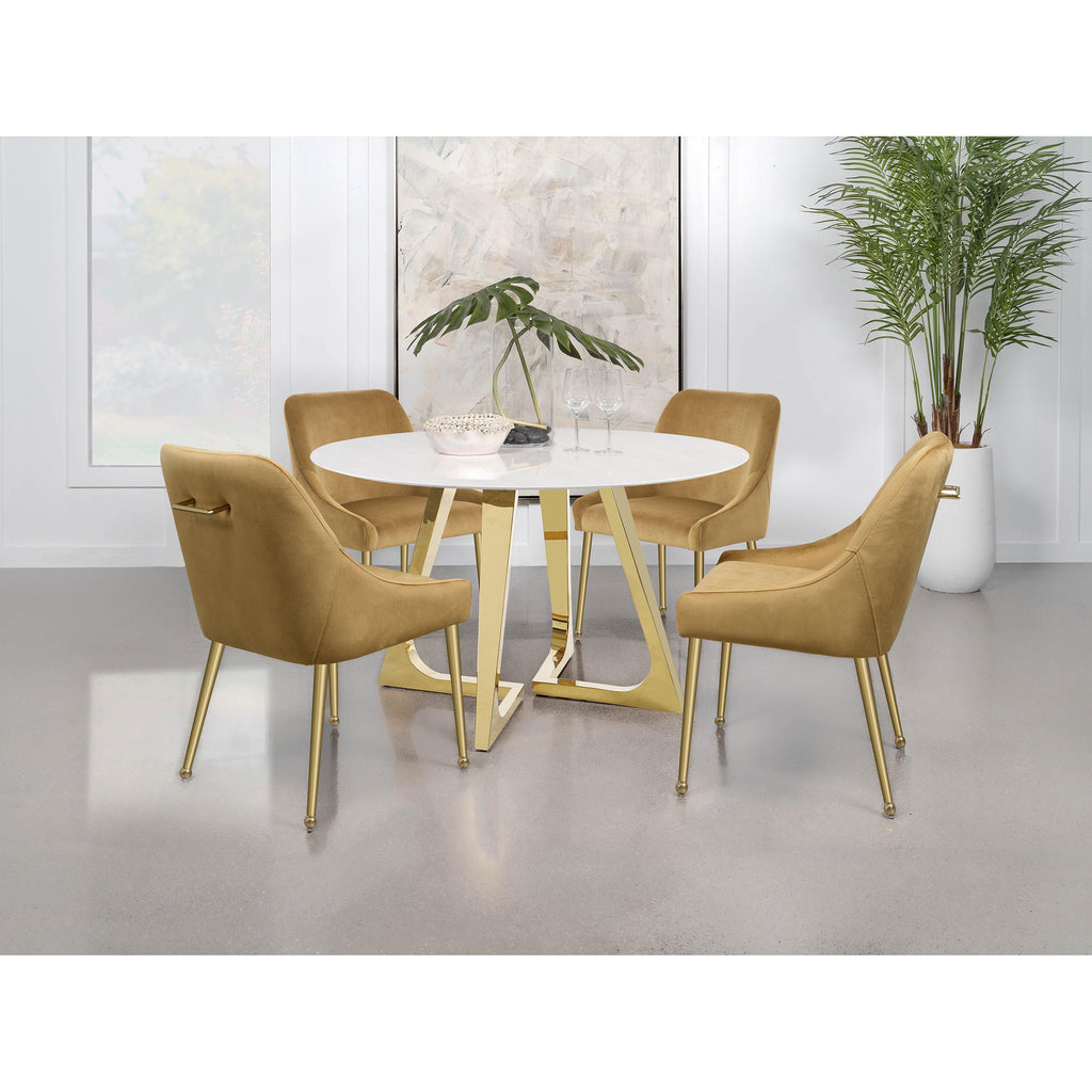 • An angled geometric base made of gleaming gold finish stainless steel adds a shapely visual impact