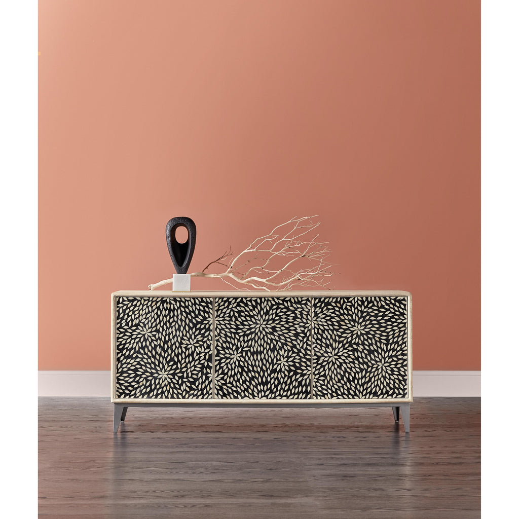 • Finish: Light wood finish on outside of case. Black and white bone inlay on the door fronts. Gray metal base.