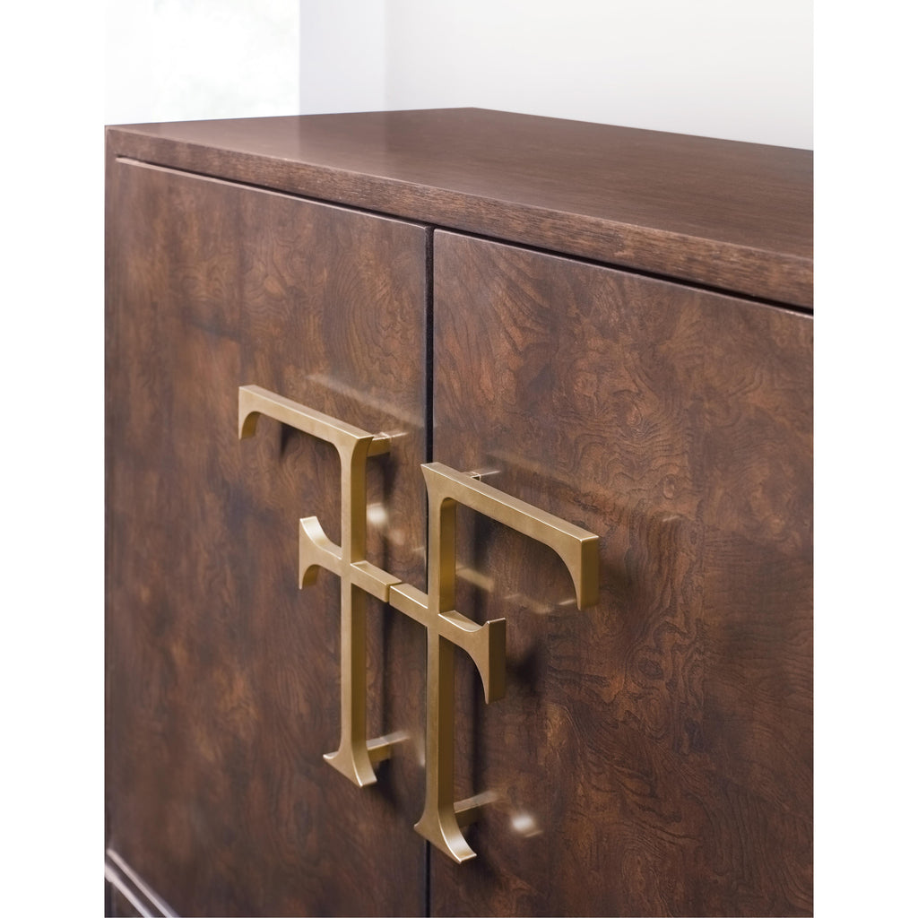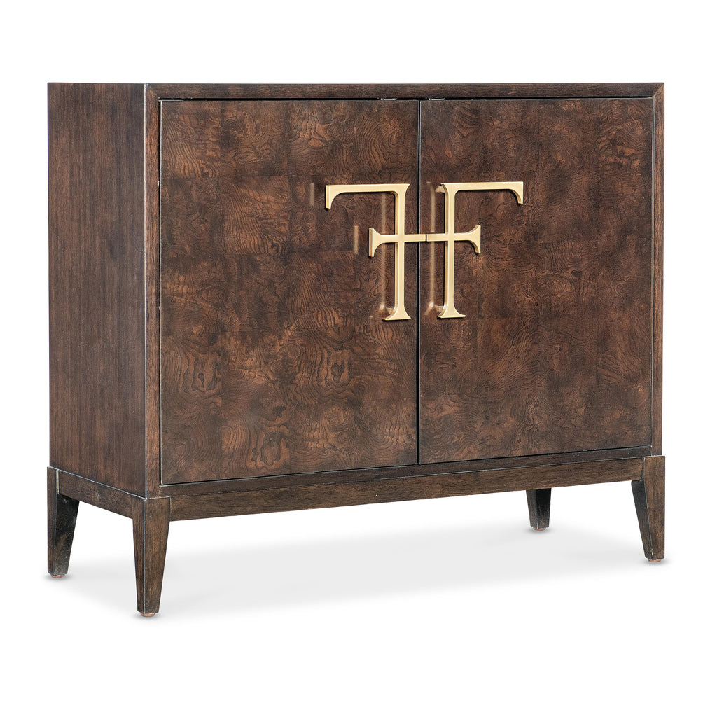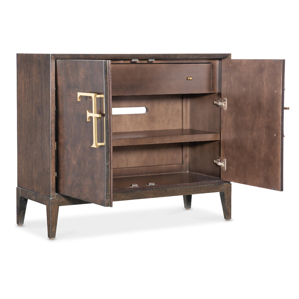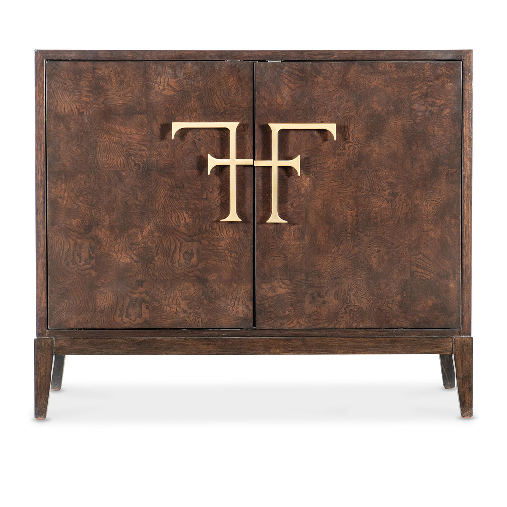 • Finish: Dark wood finish with a brass HF hardware and small round knobs on the interior drawer