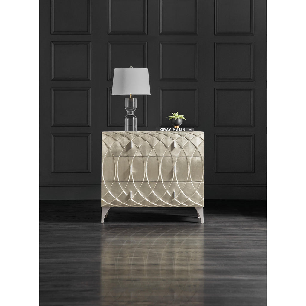 • Finish: German Silver Foil with small silver bar pulls and silver metal legs