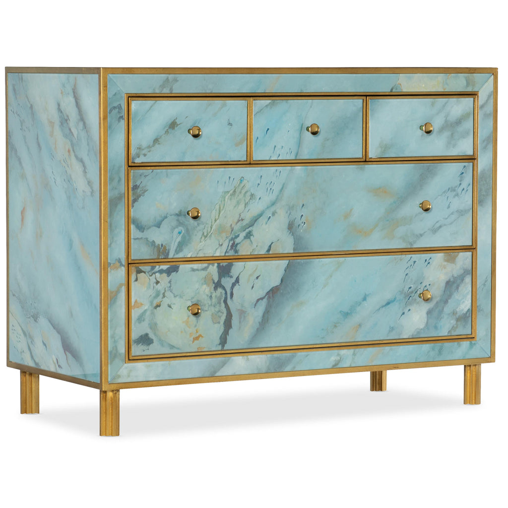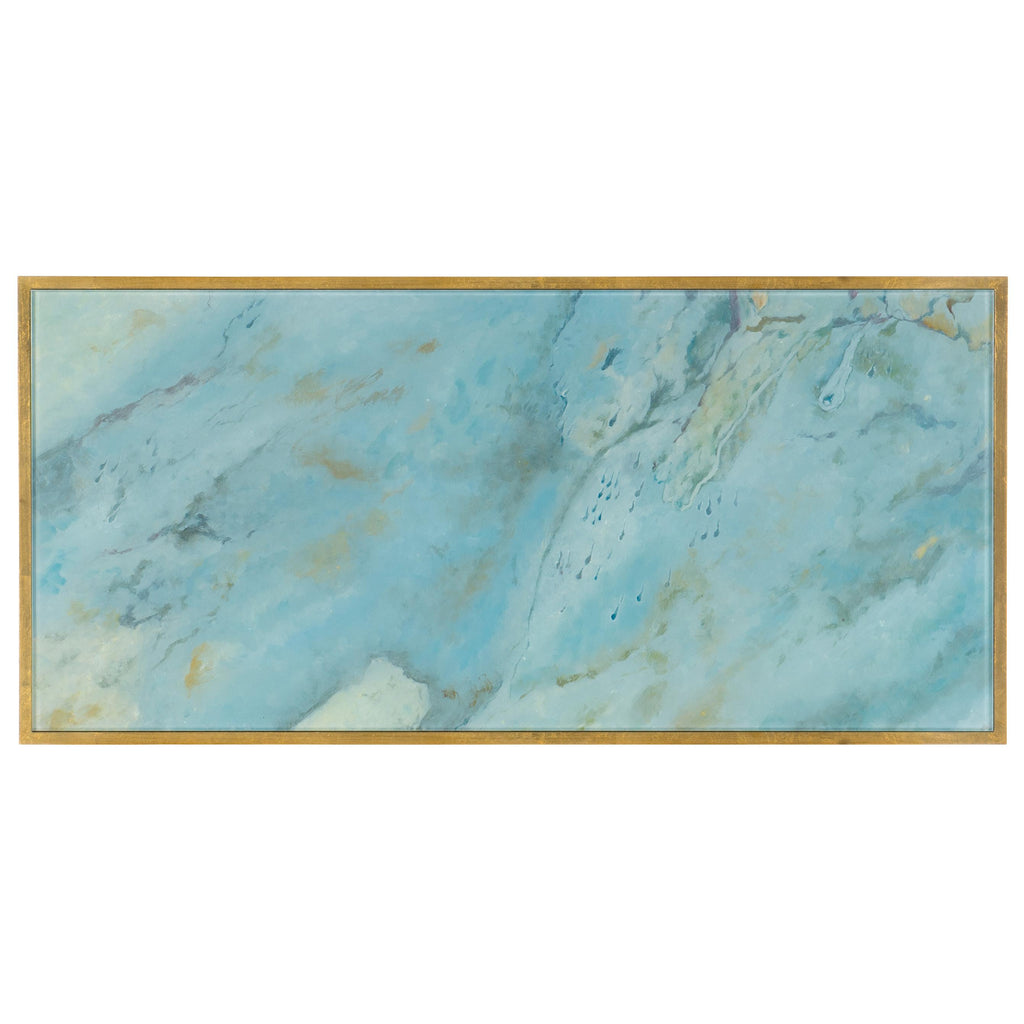 • Finish: Reverse hand painted glass in blue color motif with gold leaf legs and frame and brass finished metal knob hardware