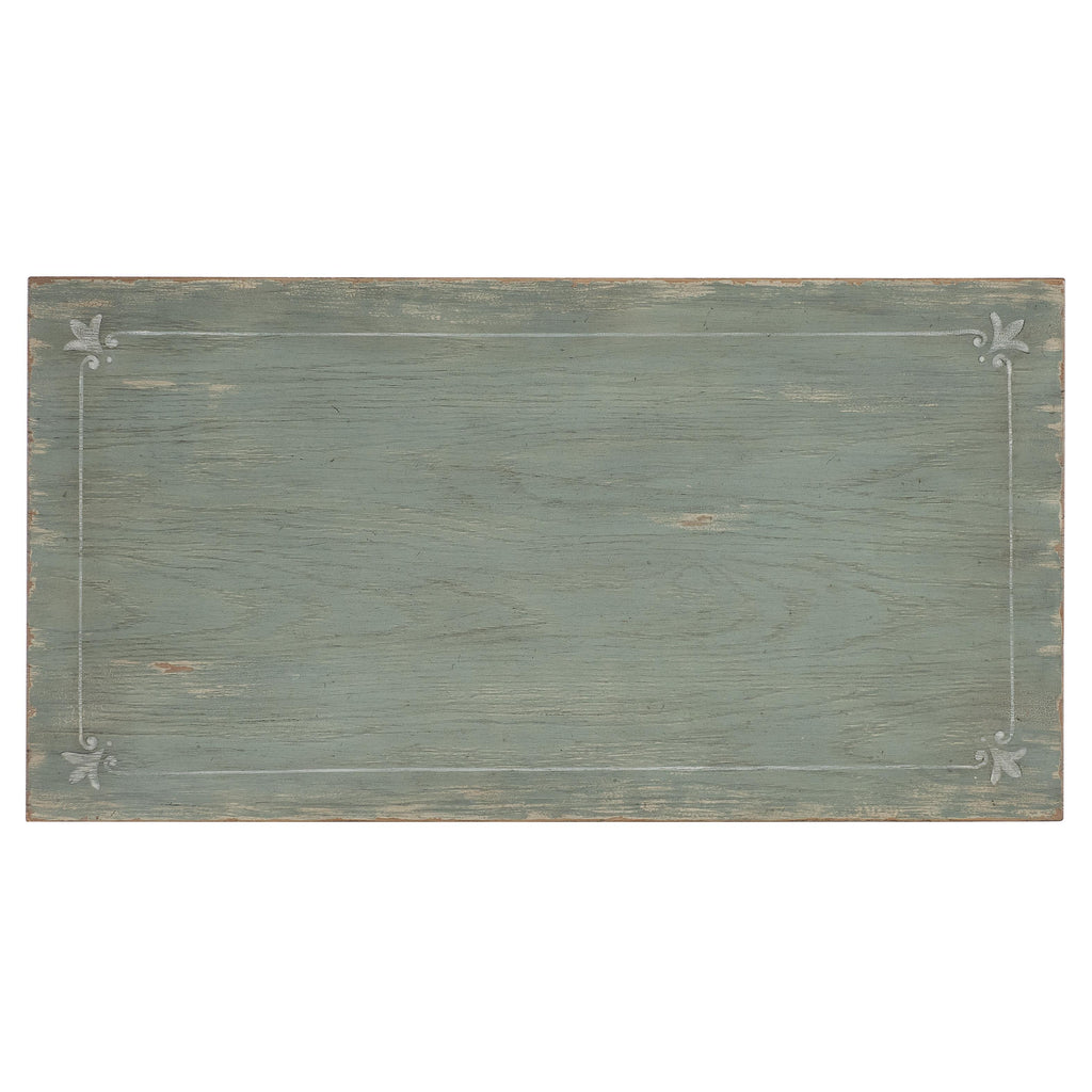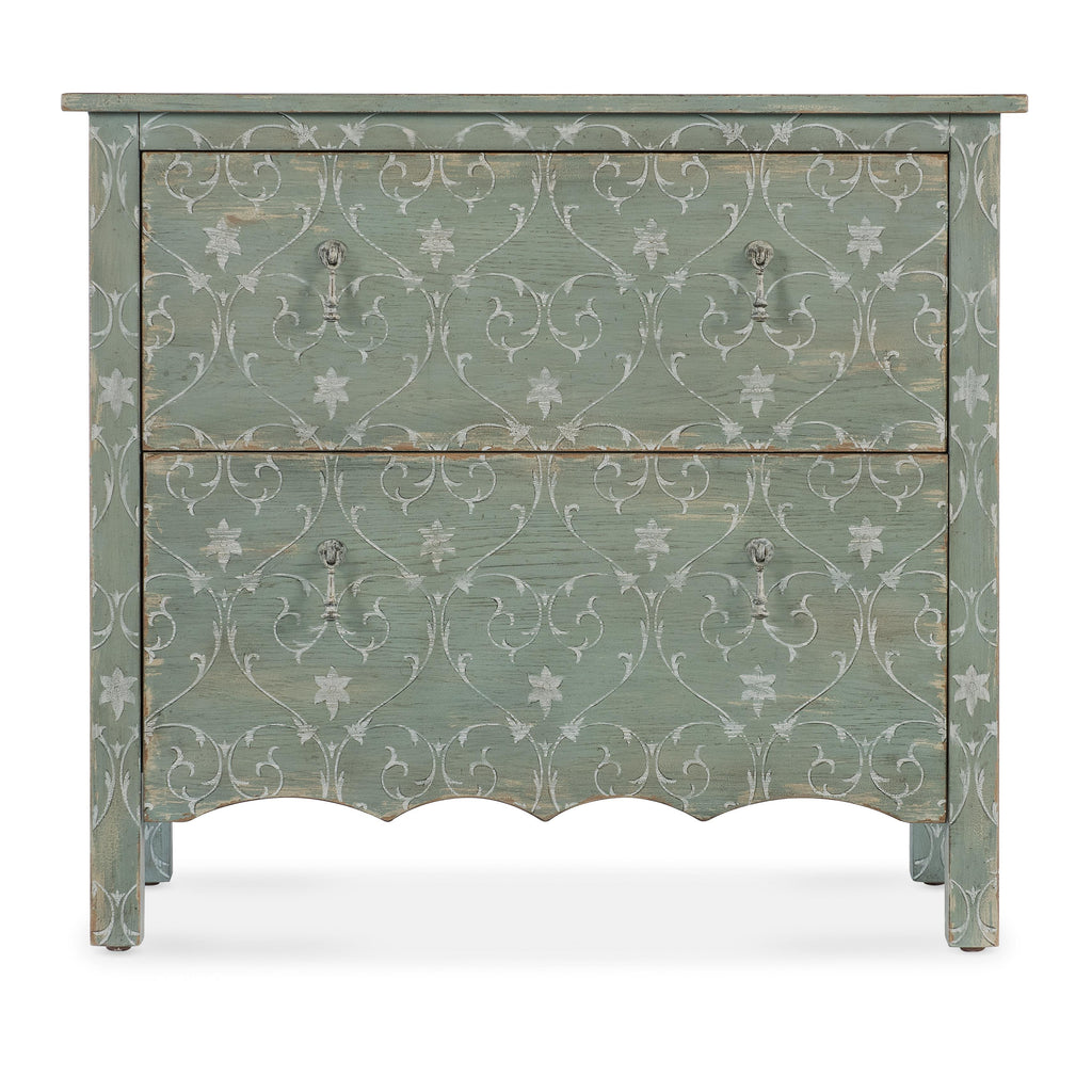 • Finish: Antique green finish with distressing and rub-through. The accent chest also features a white finished scroll pattern. Metal alloy tear-drop pulls in an antique pewter finish with white hang-up.