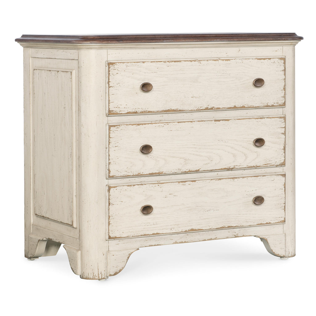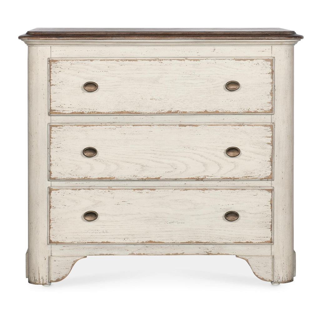 • Finish: Daisy finish on base and Honey finish on top. The Americana Daisy finish is a time worn white finish on cathedral oak veneers representing the natural wear one might expect of pieces passed down through the family over time revealing the rich oak character beneath. The Americana Honey finish features a gentle, warm brown tone. The distressing hints at the passage of time, while the smooth surface invites you to run your fingers across it, connecting you with the generations who came before. Metal alloy pulls in an antique bronze finish.