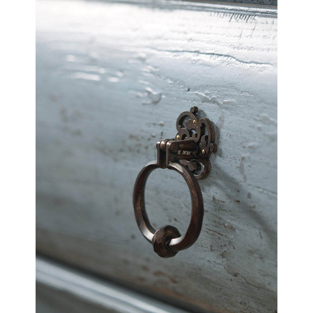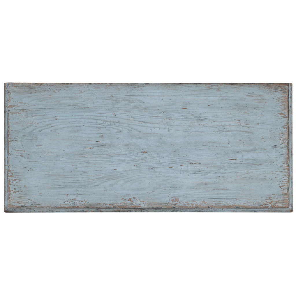 • Finish: Skylark: Blue finish with natural wood undertones. Distressing includes rasping, gouging and wormholes.
