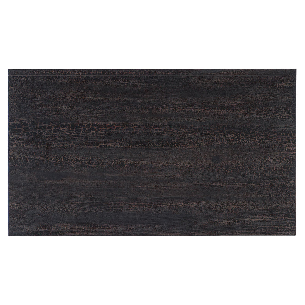 • Finish: Charred Timber: inspired by the restorative beauty of a fire-ravaged forest. Distressing includes worm holes, rasping, gauging, plane shock, hand plane, drawknife, wire brush and screw head. Dark brushed bronze metal legs and bail pulls.
