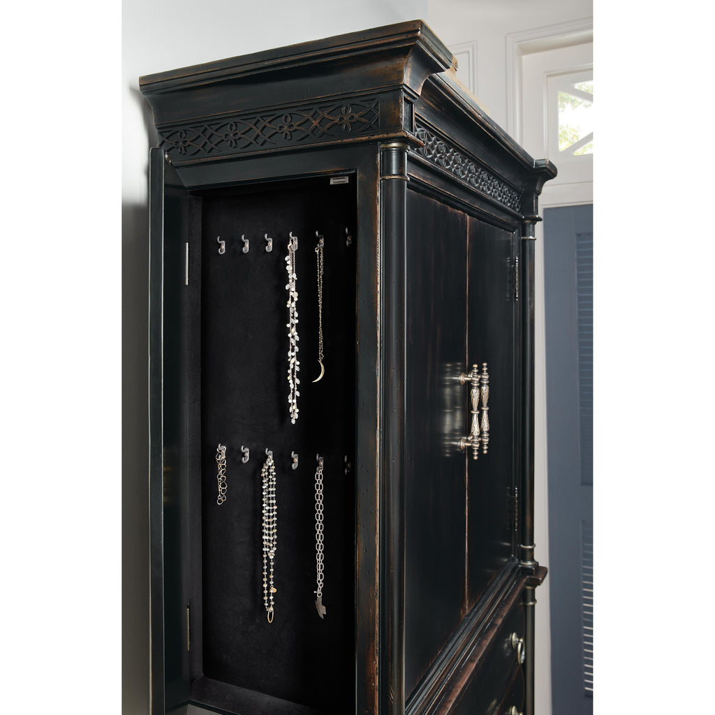• One self-closing drawer behind front doors with a removable felt liner and removable felt jewelry tray