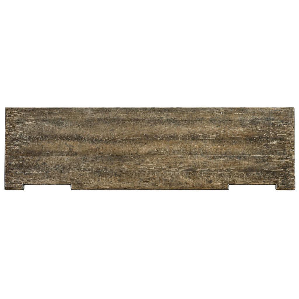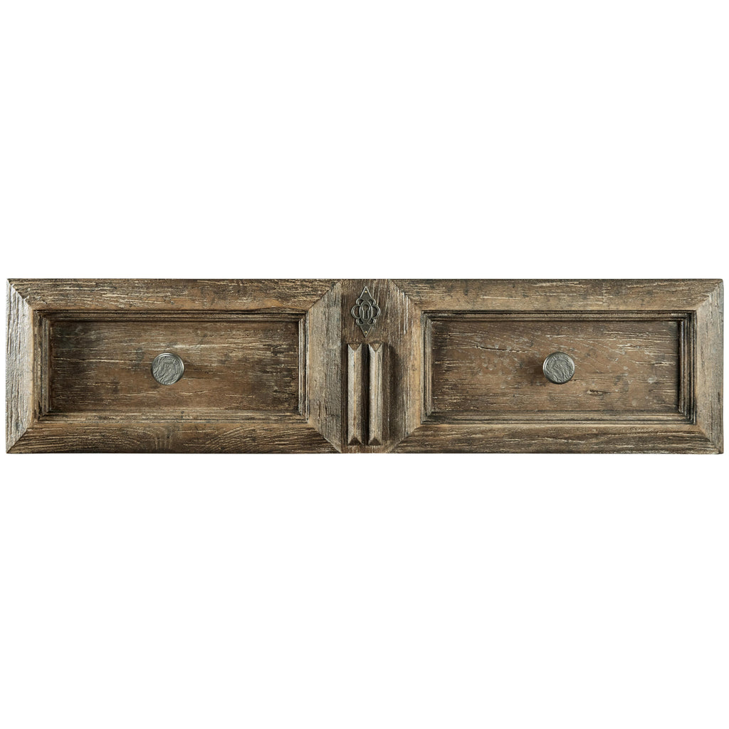 • Finish: Wash off, a dry, medium wood tone finish with distressing. Distressing includes sandblasting, drawknife, wormholes, stoning, graver, rasping and hand planing. Gunmetal finished ring pulls and knobs.