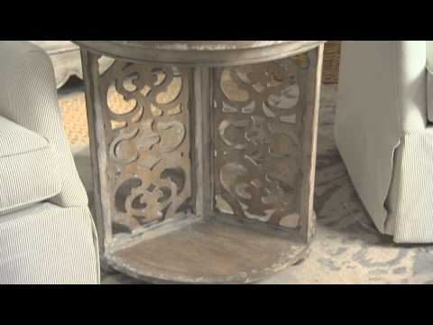 • Finish: Pecky pecan veneers are warmed by a soft amber color and a touch of aged white paint to highlight distinctive grains and moldings in the Caramel Froth finish. Custom-designed, generously scaled burnished bronze drawer pulls and hardware is inspired by antiques. Distressing includes scraping lines, sloping lines, rasping and wormholes.