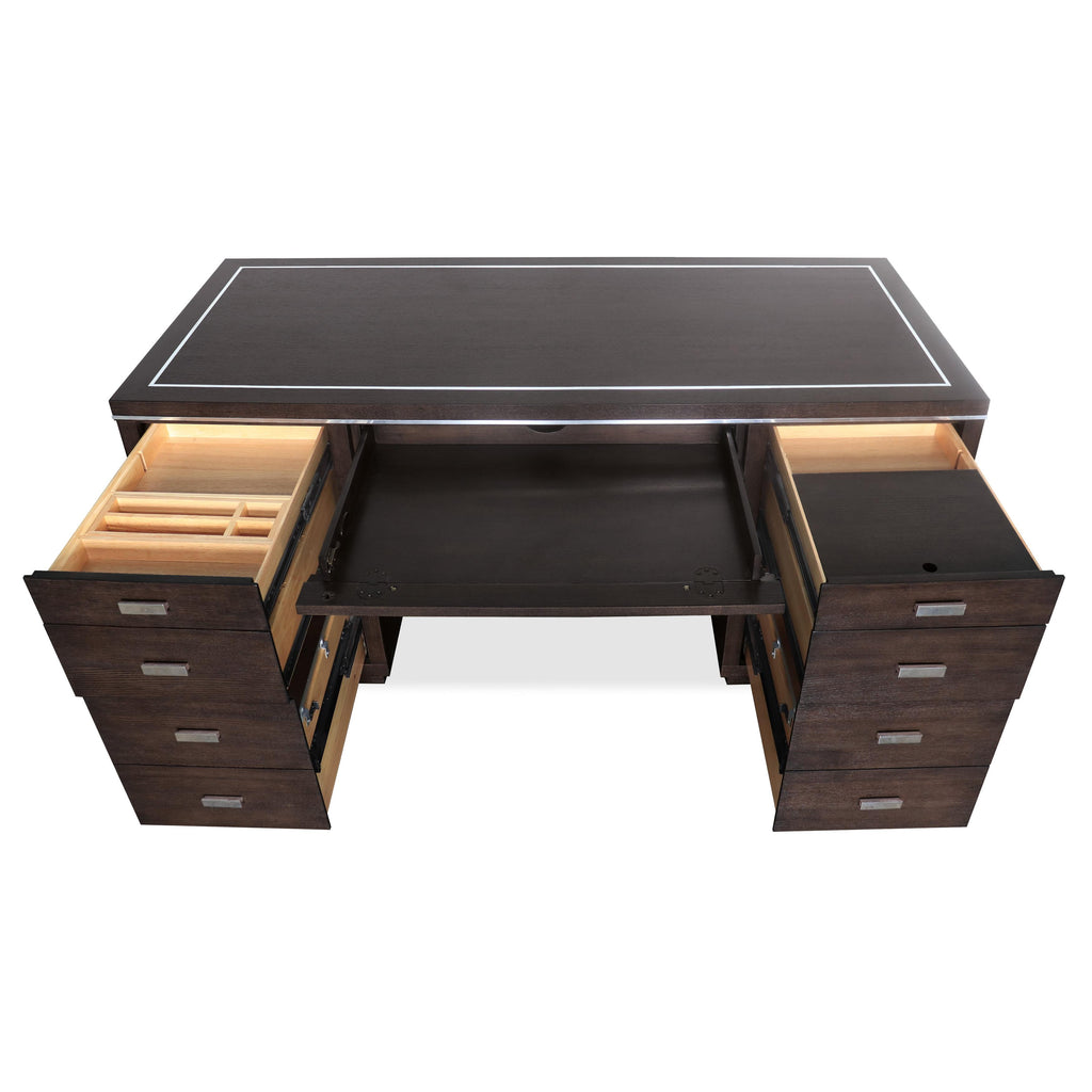 • Top left and right drawers are on 100lb full extension metal ball bearing slides with removable divider inserts, one removable writing slide and one removable pencil drop-in that can be used on either side