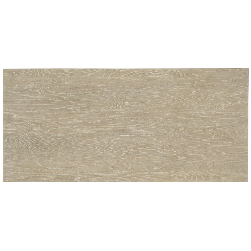 • Finish: Terrain: a soft, taupe finish on oak veneers. Distressing includes dry brushing. Champagne colored bar pull hardware and metal base.