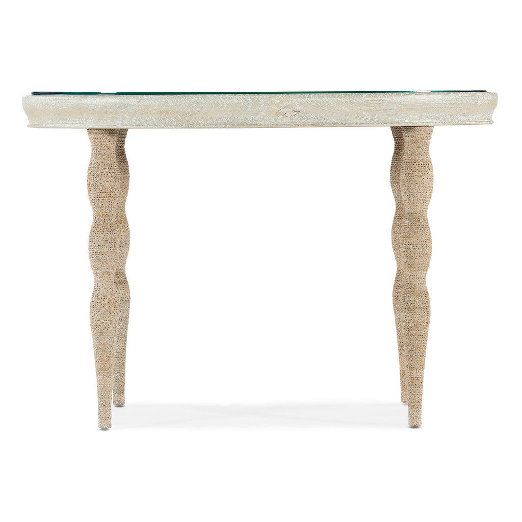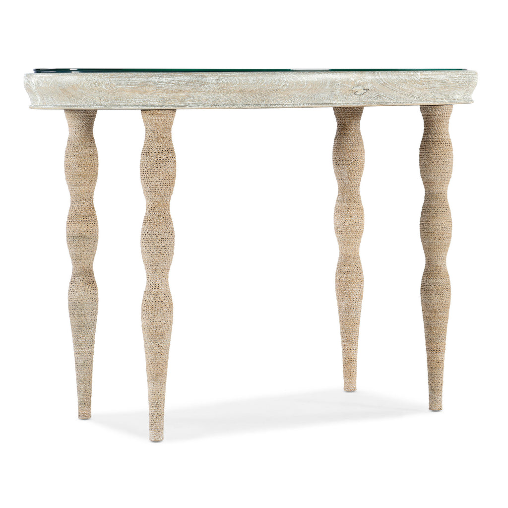 • Finish: Surf: light, airy whitewashed oak. Neptune: whitewashed rope wrapping. Painted glass top in blue and yellow tones. Distressing includes sandblasting and wire brushing.