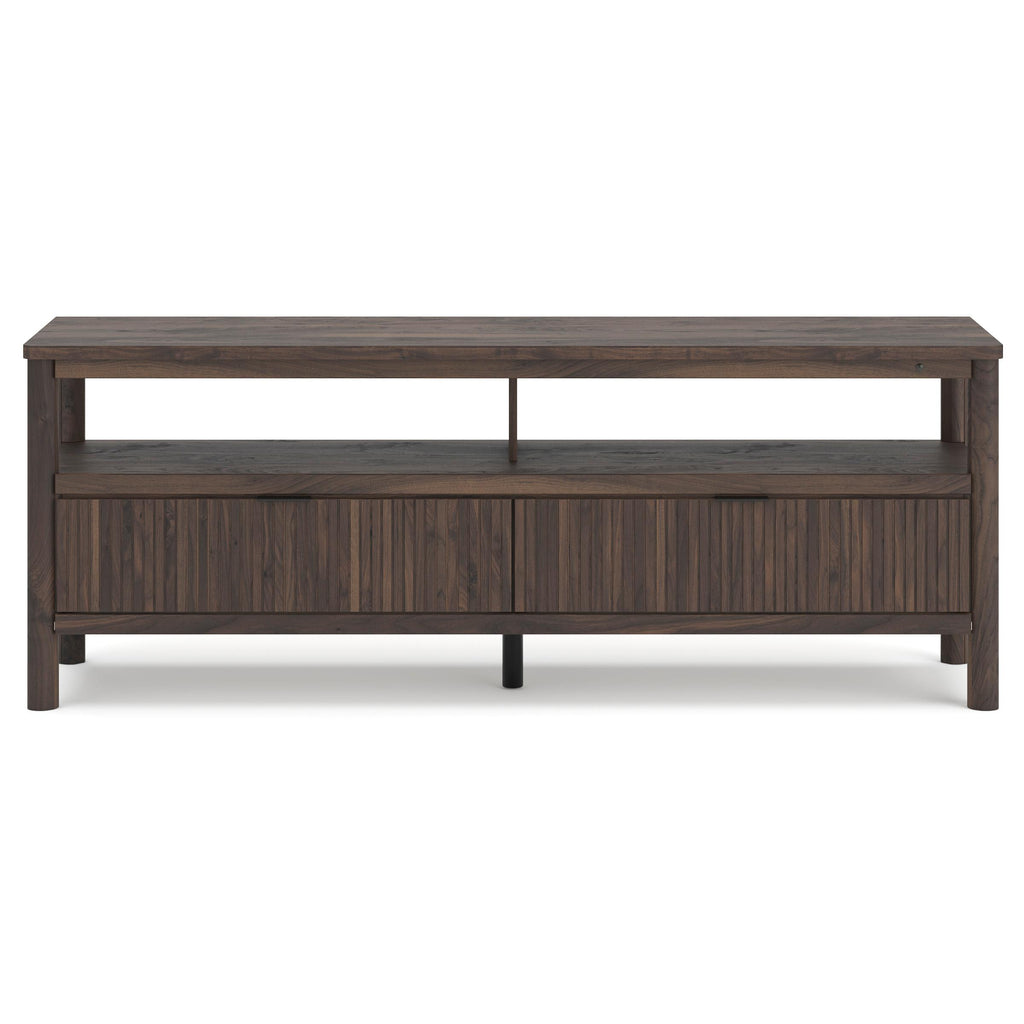 Crafted with both form and function in mind, this TV stand brings a dash of retro-cool character to your modern... Crafted with both form and function in mind, this TV stand brings a dash of retro-cool character to your modern boho aesthetic. A reeded design on its drawers adds an on-trend touch to storing entertainment essentials. Warmly welcoming with a rich brown finish, the TV stand pairs well with muted hues, earth tones and other neutrals alike. And for added ambiance, lighting under the top brings a cool vibe to your favorite shows or video gaming. What a refined take on easygoing style. View more