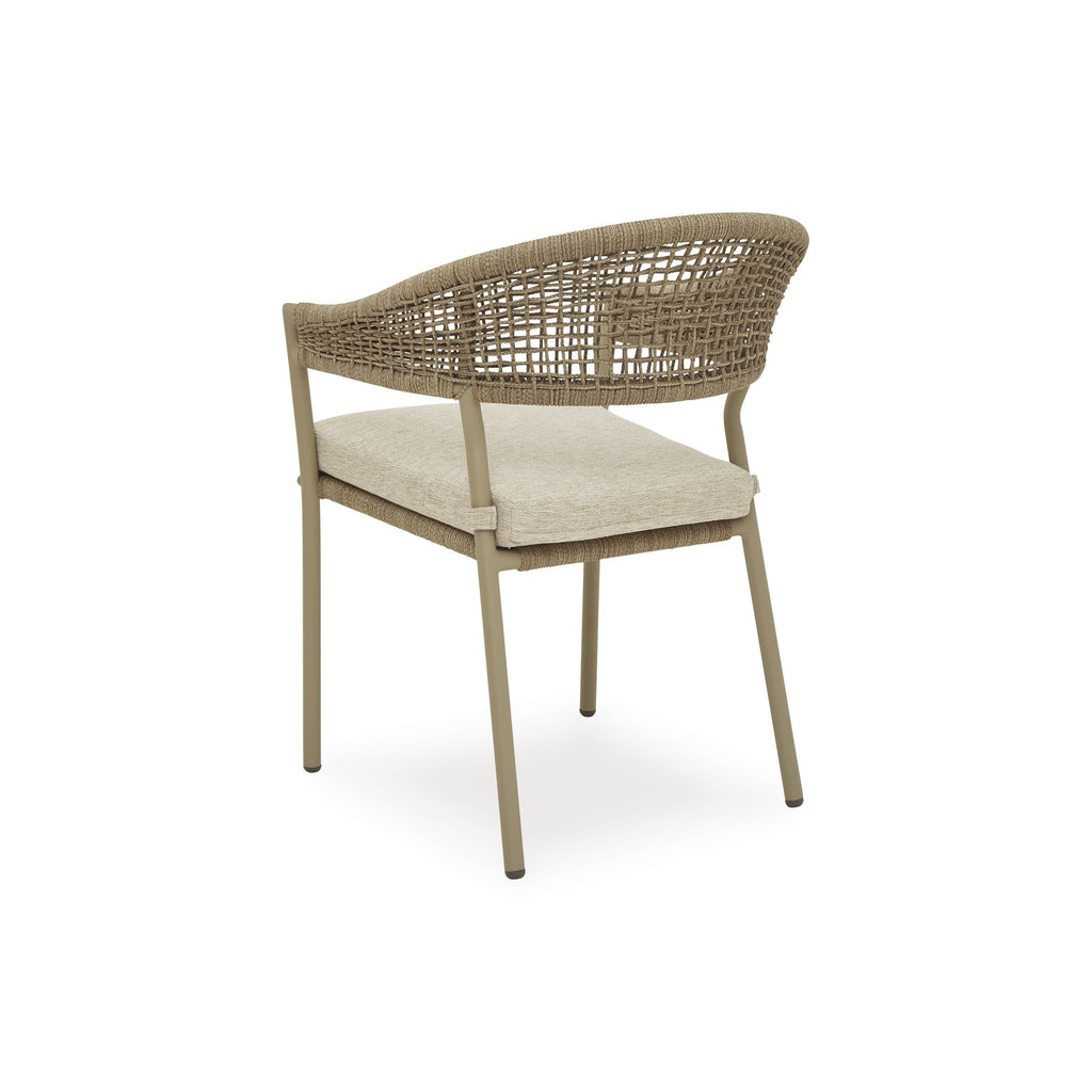 Whether decking out your deck or patio or making a splash by the pool, this outdoor arm chair with cushion... Whether decking out your deck or patio or making a splash by the pool, this outdoor arm chair with cushion is all about easy-breezy outdoor living. Its gently curved back features a nicely neutral polyester rope wrap over a sturdy, rust-resistant aluminum frame that’s sure to weather the seasons beautifully. The cushion is covered in high-performance Nuvella® fabric that withstands the elements and is oh-so-easy to clean. View more